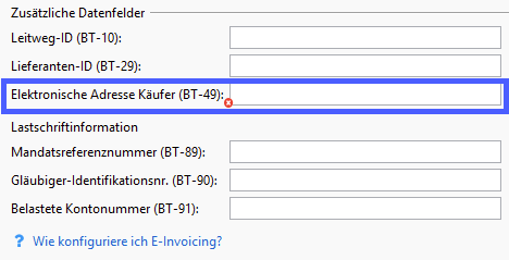 Die zugehörige rote Validierungsmeldung lautet: Profil Debitor: Die Elektronische Adresse Käufer (BT-49) muss eine gültige Peppol Teilnehmer-ID sein, wenn das E-lnvoice Format VRBL Peppol BIS Billing 3.0 (Peppol Transfer) aktiv ist.
