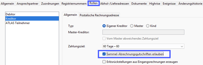 Aktivierung in der Rolle „Kreditor“: Im Kreditorenprofil steht eine neue Konfigurationsoption zur Verfügung, mit der der Kreditor als berechtigt für Sammel-Abrechnungsgutschriften gekennzeichnet werden kann.