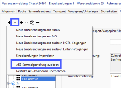 Die Funktion der Sammelgestellung, die es bereits in AES gibt, ist nunmehr auch in NCTS verfügbar. Für alle Ausfuhranmeldungen, die auf ein Versandverfahren übernommen werden sollen, gibt es unter dem Splitbutton für Einzelsendungen die neue Funktion „Sammelgestellung auslösen“: