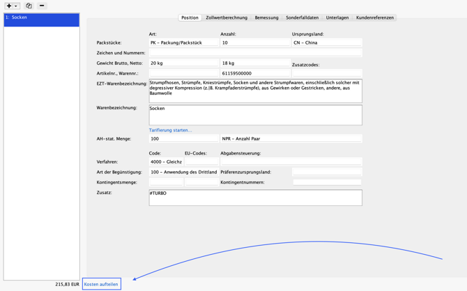 Einfuhr: Verschiebung des „Kosten aufteilen“ Links