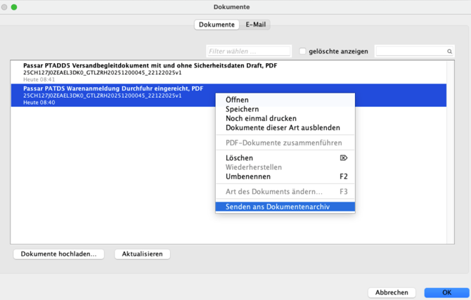 Danach öffnet sich ein neues Fenster. Wenn die Schnittstelle Dokumentarchiv aktiviert ist, gibt es die Möglichkeit, Dokumente erneut zu senden.