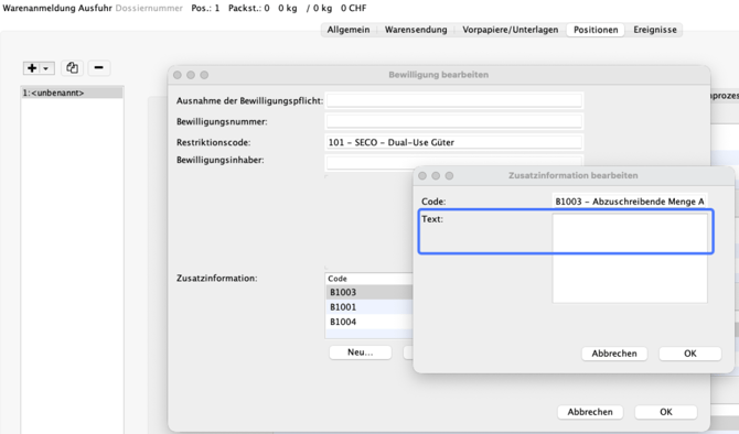Für jede Einzelsendung, die ein AES-Vorpapier hat, werden alle Warenpositionen aus der Ausgangserlaubnis in die Versandanmeldung übernommen.