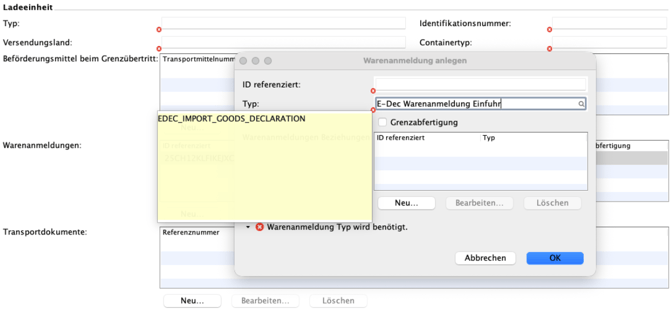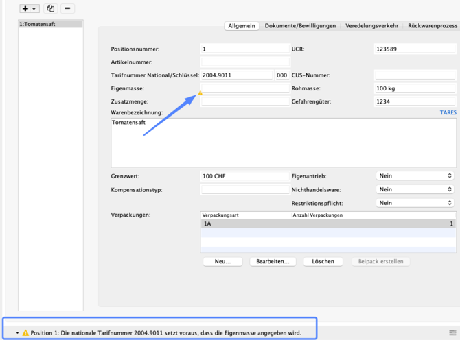 Im Feld „Eigenmasse“ wird nun, je nach Tarifnummer eine gelbe Warnung angezeigt.