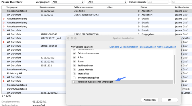 Nach der Referenz ZE kann ab sofort gesucht werden, sofern man die Spalte in der Übersicht anzeigen lässt (Rechtsklick auf Tabellenkopf > Spalten bearbeiten)
