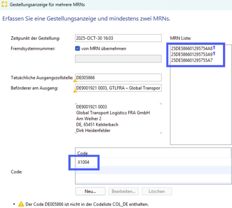 Der Code „X1004“, der ATLAS anzeigt, dass diese AES-MRNs für Versand „reserviert“ werden soll, ist vorbelegt.