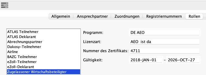 Im letzten Schritt muss den zu prüfenden Partnern die Rolle „Zugelassener Wirtschaftsbeteiligter“ zugewiesen und entsprechend gefüllt werden.