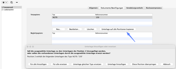 Ein Vorpapier/Begleitpapier kann auf alle Positionen kopiert werden.
