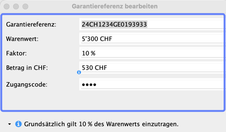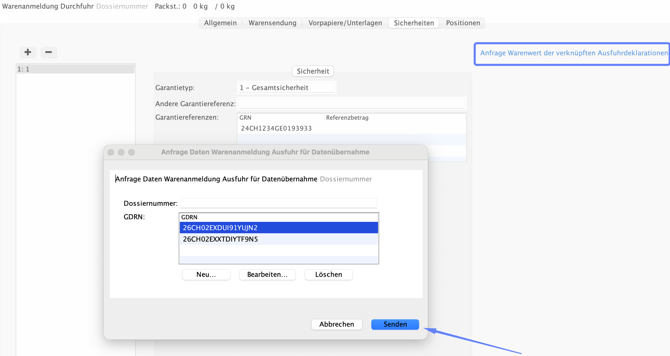 Wenn unter Vorpapier EXPO GDRNs verknüpft sind, kann man im Reiter Sicherheit mit Klick auf „Anfrage Warenwert der verknüpften Ausfuhrdeklarationen“ den Warenwert beim BAZG erfragen. Dieser wird dann im Feld Warenwert eingetragen und mit hinterlegtem Faktor 10 % wird der Referenzbetrag berechnet.