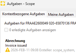 Wenn eine Ausgangsrechnung erstellt wird, wird ihr Status zunächst als „finish pending“ angezeigt, bis eine Bestätigung vom KSeF‑System eingegangen ist. Nach erfolgreicher Bestätigung zeigt Scope die KSeF‑ID der Rechnung in einer neuen Spalte „Invoice ID (tax authority)“ in der Offene‑Posten‑Übersicht (Ausgangsbelege) an.