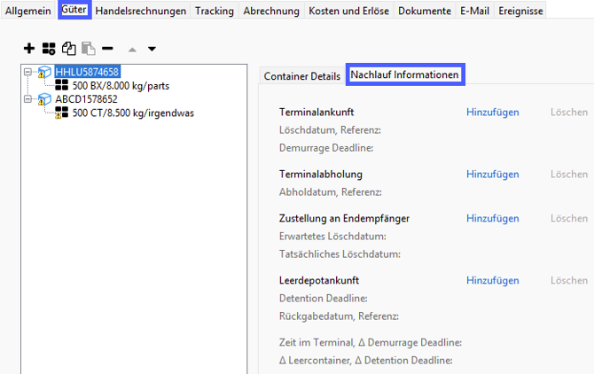 Bei FCL-Seefracht-Importsendungen wurde im Containerbereich ein neuer Reiter eingeführt, um die Containerbewegungen von den allgemeinen Containereigenschaften zu trennen.