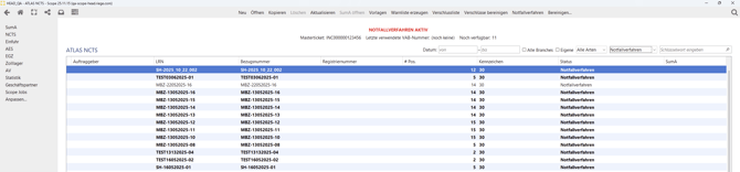 Ist das Notfallverfahren aktiv, so wird dies aktiv in Scope angezeigt und eröffnete Verfahren werden mit dem Status „Notfallverfahren“ dargestellt.