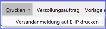 Wird nun ein neues Versandverfahren eröffnet, so muss dies über die Aktion „Drucken“ und dann „Versandanmeldung auf EHP“ im Vorgang erstellt werden.