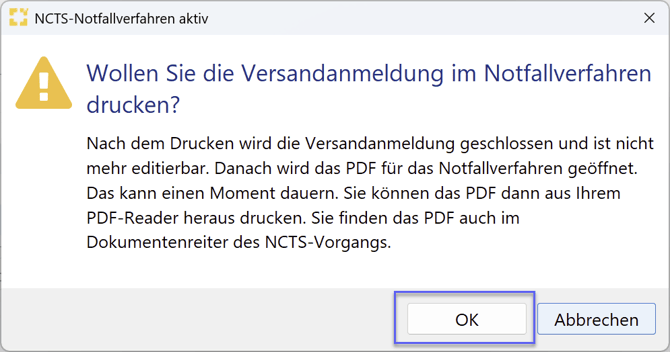 Im Anschluss wird erneut eine Abfrage aufgerufen, die noch einmal bestätigt werden muss. Wird dies mit „OK“ bestätigt, so wird jetzt das Notfallverfahren als PDF eröffnet.