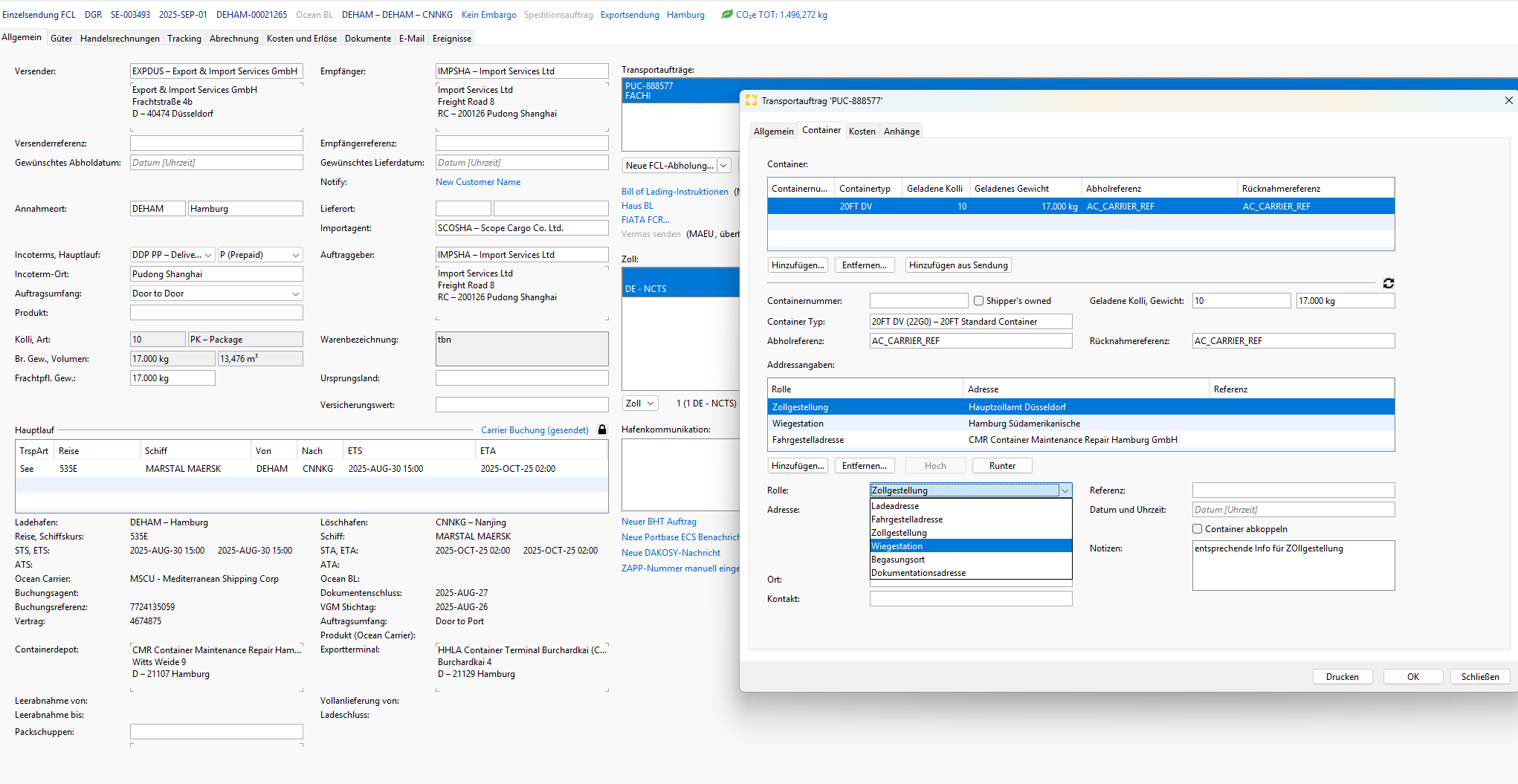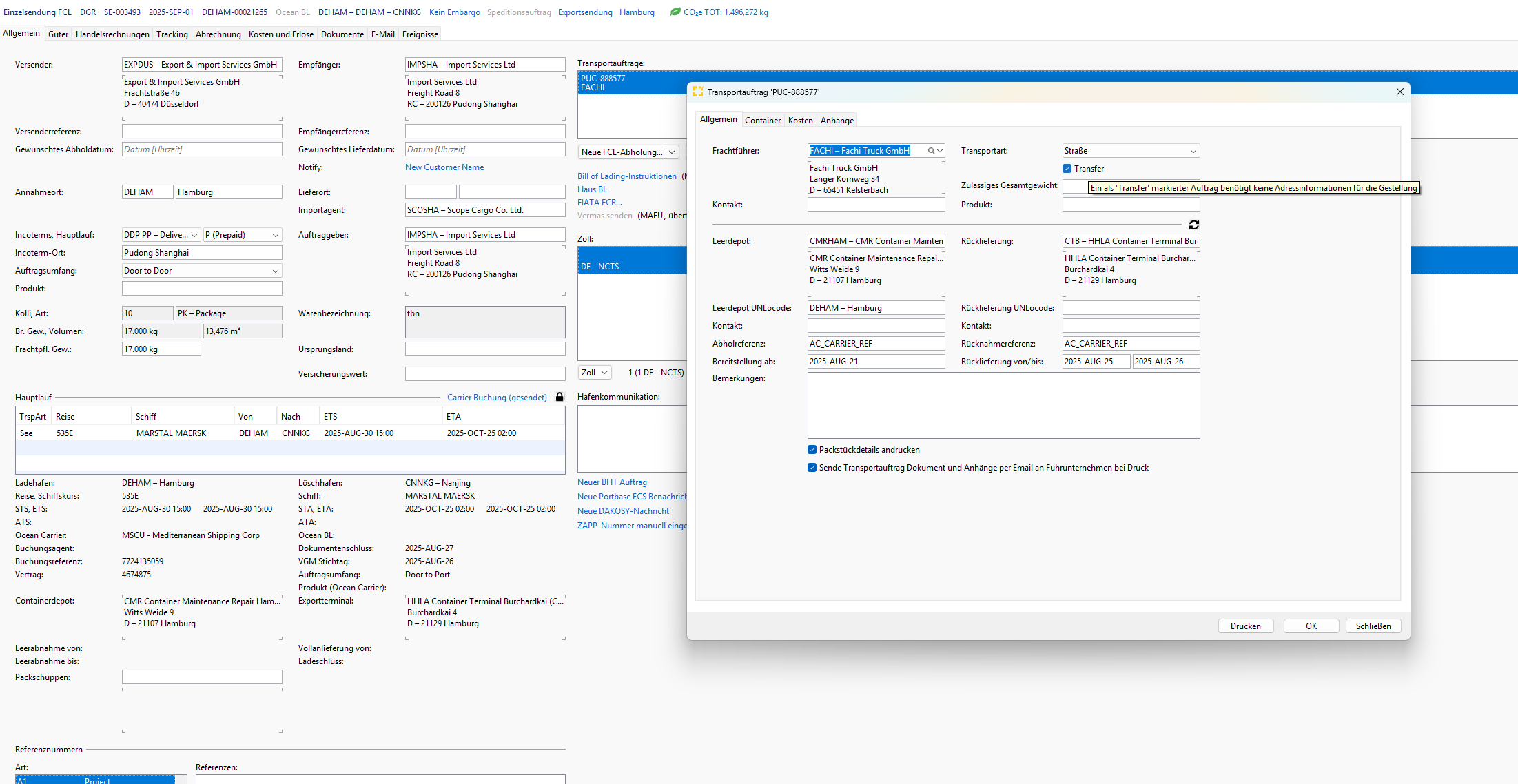 Für diesen Transfer-Transportauftrag sind keine Adressangaben für das Laden- oder Entladen des Containers erforderlich.