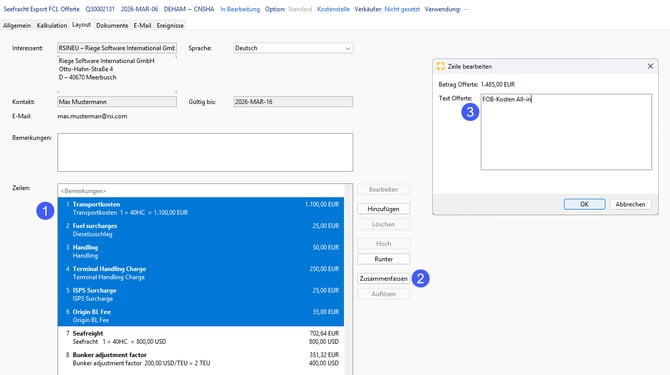 In Ihrer Offerte erscheinen nun für Ihren Kunden ersichtlich nur noch 3 Zeilen, FOB-Kosten All-in, Seefracht und Bunker adjustment factor.