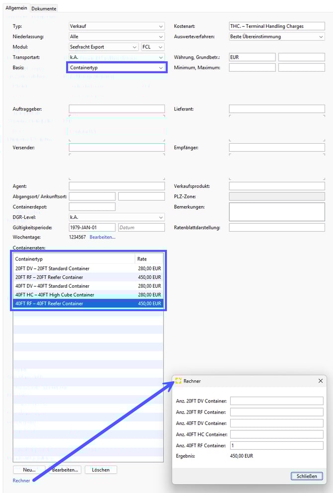 Beispiel: Sie möchten ihren Kunden für die THC (Terminal Handling Charge) bei allen Dry Containern 280,00 EUR und für Reefer Container 450,00 EUR in Rechnung stellen.