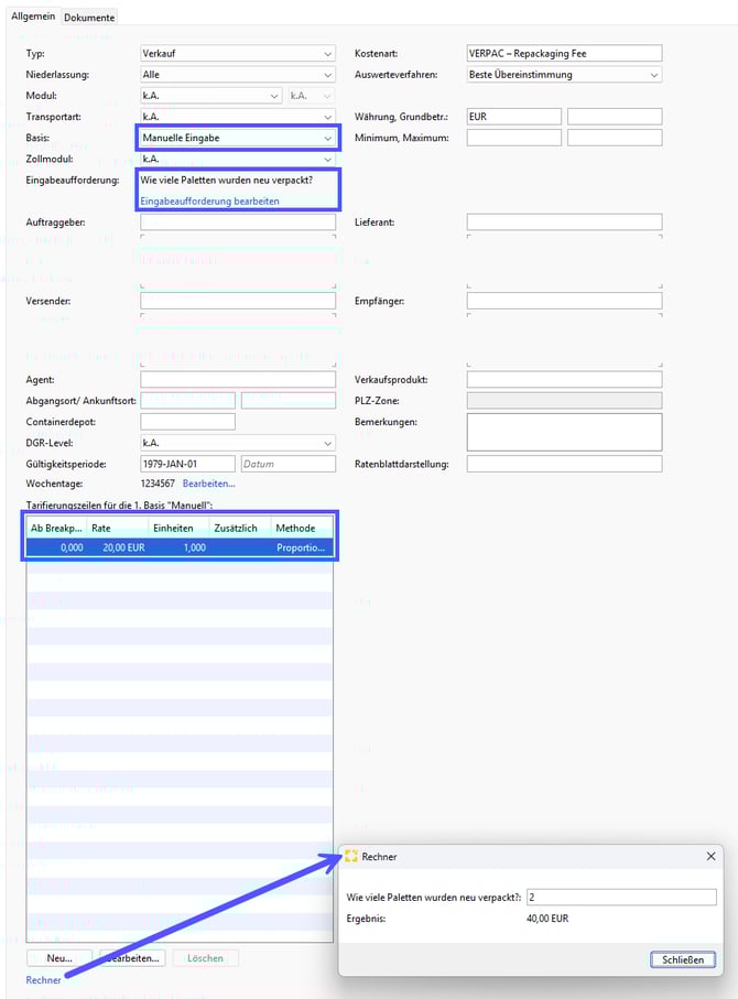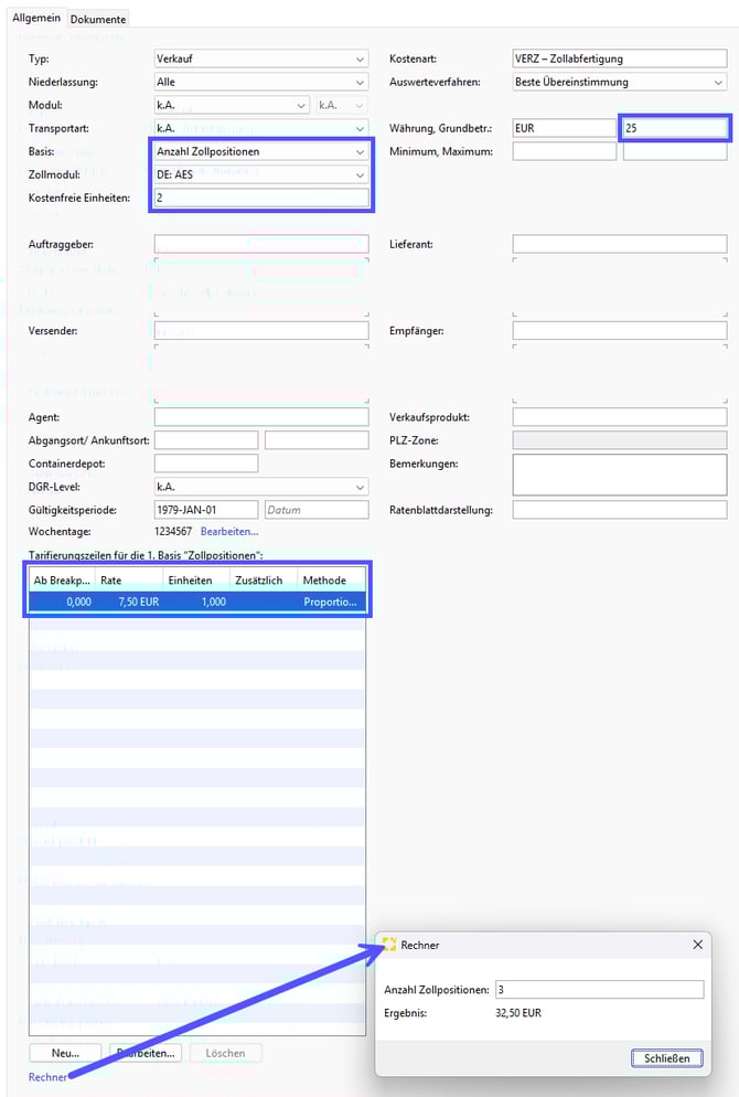 Beispiel: Sie möchten ihrem Kunden für die Zollabfertigung im Zollmodul AES einen Grundbetrag von 25,00 EUR in Rechnung stellen. Dieser Grundbetrag beinhaltet 2 Zollpositionen und jede weitere Position berechnen Sie mit 7,50 EUR.