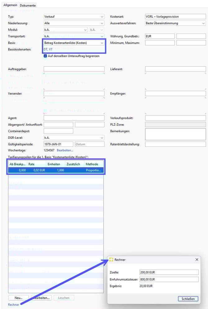 Beispiel: Sie möchten die Vorlageprovision in Höhe von 2 %, basierend auf der Summe der Beträge (Kosten) von DT (Zölle) und VT (Einfuhrabgaben) ihrem Kunden in Rechnung stellen.