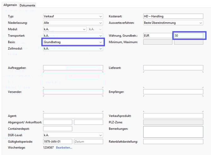 Beispiel: Sie möchten für die Kostenart Handling Ihren Kunden grundsätzlich 50,00 EUR in Rechnung stellen