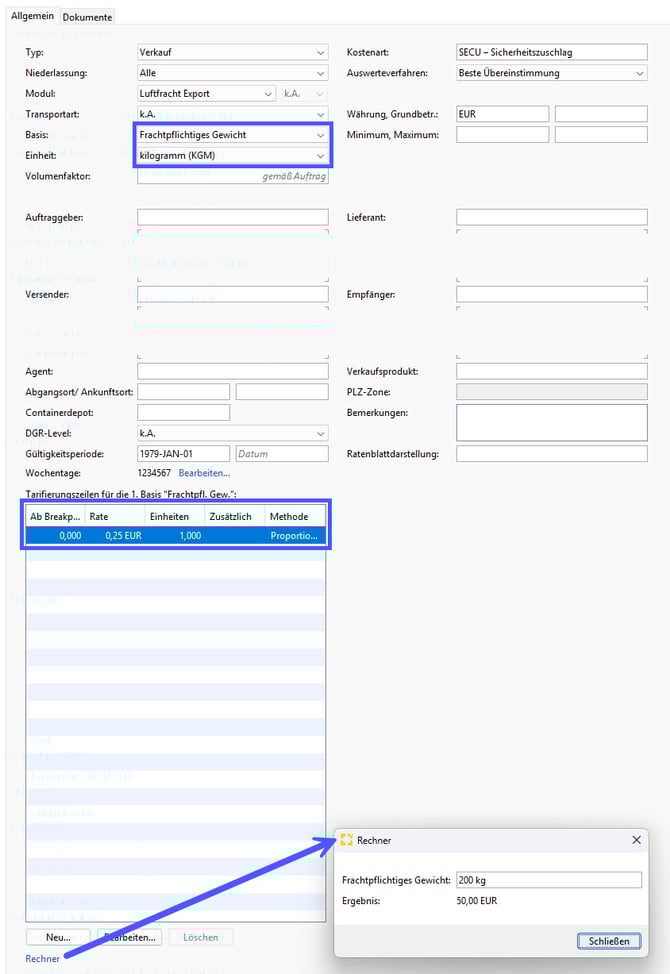 Beispiel: Sie möchten den Sicherheitszuschlag nach frachtpflichtigem Gewicht berechnen und Ihren Kunden 0,25 EUR pro kg in Rechnung stellen.