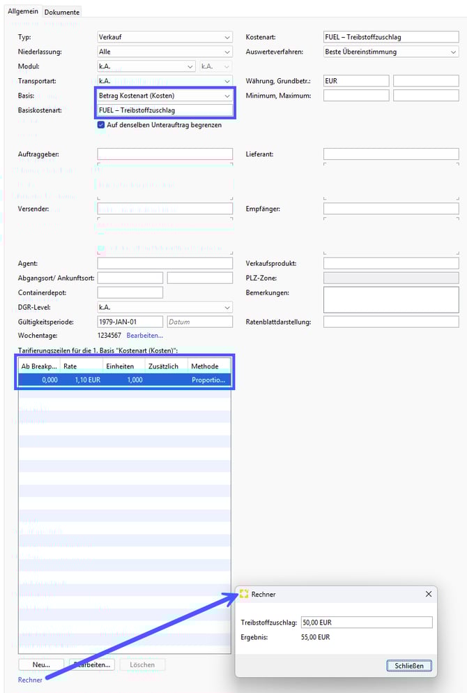 Beispiel: Sie möchten im Verkauf des Treibstoffzuschlags 10% auf den Einkaufspreis der Treibstoffkosten aufschlagen.