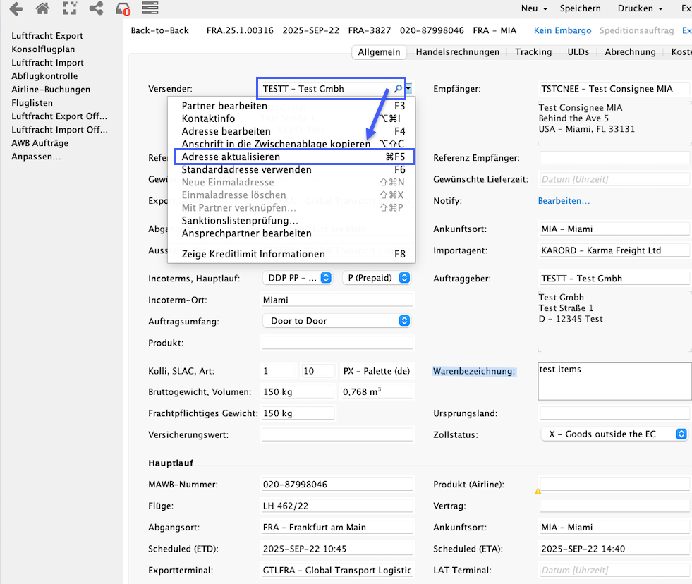 Um die Partnerdaten innerhalb einer bestehenden Sendung, Rechnung oder Zollanmeldung zu aktualisieren, öffnen Sie den entsprechenden Vorgang, klicken im Partnerfeld auf den Pfeil und wählen „Adresse aktualisieren“ oder drücken Sie F5.