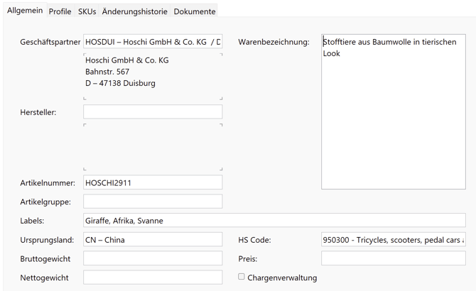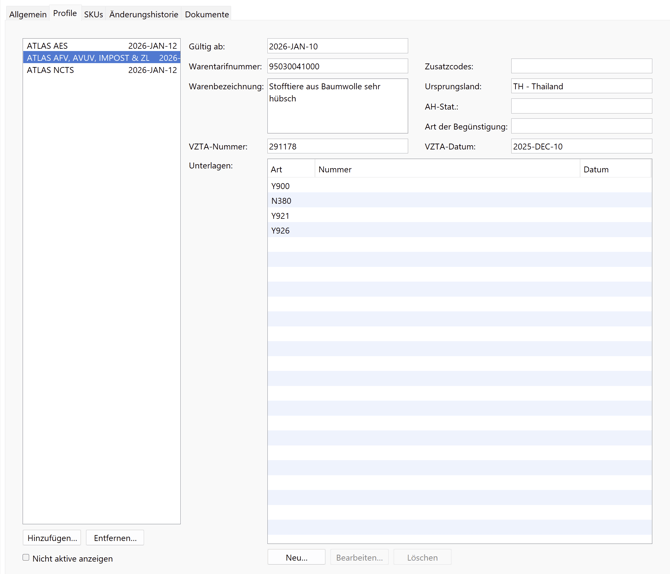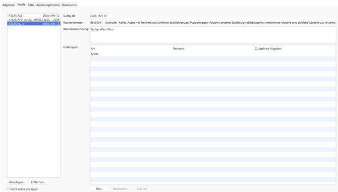 Neben Informationen wie Artikelstammhalter und Warenbeschreibung und HS-Codes, können je nach Verfahren verschiedene Beschreibungen und Unterlagen definiert werden, die dann bei der Verwendung gezogen werden.