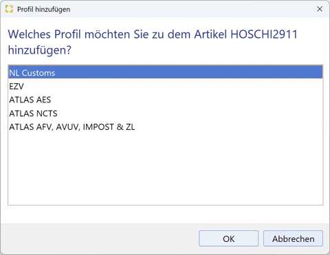 öffnet sich ein Fenster, aus dem ein Profil für das gewünschte Zollverfahren ausgewählt werden kann.