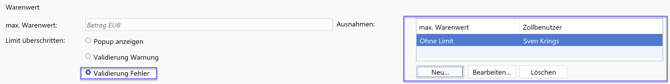 Es kann ein maximaler Wert erfasst werden. Wird dieser überschritten, kann ein Popup, eine Warnung oder ein Fehler angezeigt werden. Dies soll dazu dienen, keine Versandverfahren in unbegrenzter Höhe zu eröffnen. Es können Ausnahmen erfasst werden, sodass andere Benutzer mit höheren Warenwertfreigaben den Vorgang übernehmen und diesen an den Zoll übermitteln können.