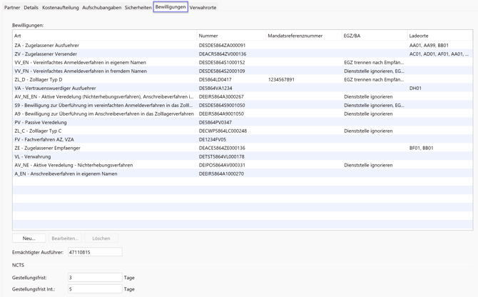 Zusätzlich können noch Gestellungsfristen als Standard für das Versandverfahren definiert werden und die Nummer des ermächtigten Ausführers