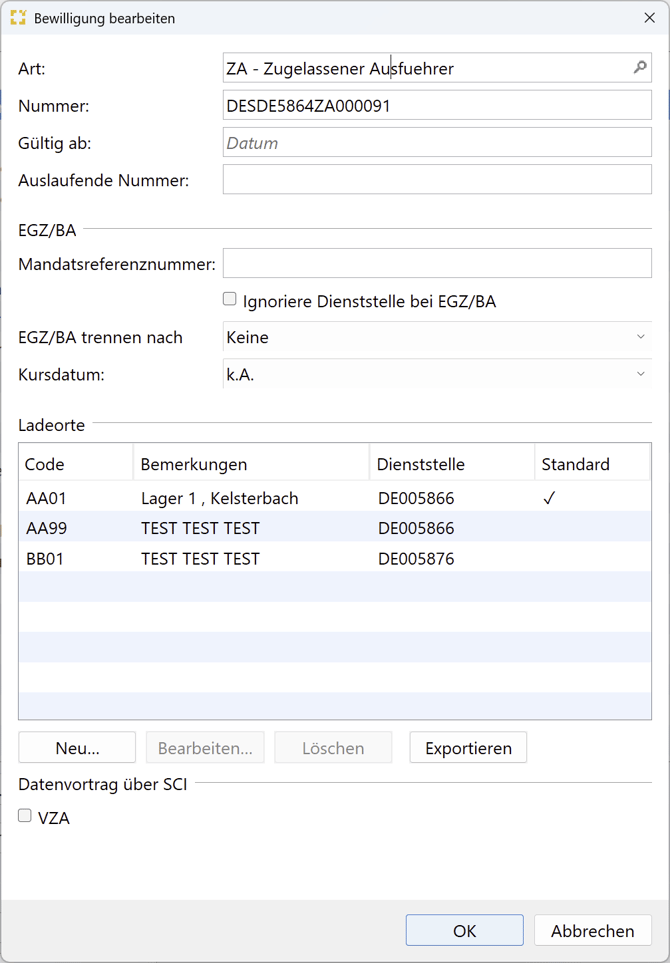 Im Reiter „Bewilligungen“ können Bewilligungen und weitere Bewilligungskausaldaten erfasst werden. Bewilligungen werden ohne Sonderzeichen erfasst. Lade- und Entladeorte können innerhalb der Bewilligung erfasst werden. Scope zieht bei einem Ort bei einer Zollstelle diesen automatisch. Sind mehrere Orte bei derselben Zolldienststelle erfasst, können diese mit der Pfeiltaste nach unten ausgewählt werden. Zusätzlich kann ein Ort als Standardort definiert werden, der immer gezogen wird, im Antrag aber angepasst werden kann.