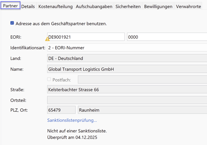 Die Rolle wird immer bei dem Geschäftspartner hinterlegt, der an Atlasteil nimmt und der Inhaber der EORI, Aufschübe oder Bewilligungen ist. Im Reiter „Partner“ wird die EORI Nummer gepflegt, inkl. Niederlassungsnummer. Diese wird direkt auf ihre Gültigkeit geprüft. Sofern keine Warnmeldung an dem Feld angezeigt wird, ist die EORI gültig. Zusätzlich kann die Adresse angepasst werden. Dies ist z. B. dann sinnvoll, wenn Waren nach Serbien gehen, da für Forwarding RS und für den Zoll die Codierung XS verwendet werden muss.