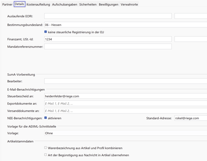 Im Reiter „Details" kan eine auslaufende EORI erfasst werden, damit Nachrichten, die noch unter der alten EORI übermittelt wurden in den korrekten Vorgang einlaufen. Des Weiteren kann ein Standard-Bestimmungsbundesland und für steuerbefreite innergemeinschaftliche Lieferungen bei Bedarf das Finanzamt sowie die UST-ID-Nummer erfasst werden. Für die EGZ kann im Falle des Einzugs der Einfuhrabgaben die Mandatsreferenznummer erfasst werden. Bei den E-Mail Benachrichtigungen können kommasepariert E-Mails erfasst werden, an die der kombinierte Einfuhrabgabenbescheid, das ABD und der AV oder das VBD (Geschäftspartner muss Inhaber des Verfahrens sein) erfasst werden. Diese Funktion soll dazu dienen, den manuellen Versand an die Kunden zu automatisieren. Daher sollten hier nur externe und keine internen E-Mail-Adressen hinterlegt werden. Beim Artikelstamm kann definiert werden, ob die Warenbezeichnung, welche an den Zoll übermitteltwird,d aus dem Artikel und dem Profil kombiniert werden soll. Als Standard wird nur die Beschreibung aus dem Profil in die Anmeldung gezogen. Die SumA-Vobereitung bezieht sich auf die CHGTST. Des Weiteren können aus der CusTax zurückgemeldete Präferenzcodes (100, 200, 300 etc) in den Artikelstamm geschrieben werden, wenn die Checkbox aktiviert ist. Zukünftig würden dann die vom Zoll zuletzt zurückgemeldeten Präferenzcodes verwendet werden.