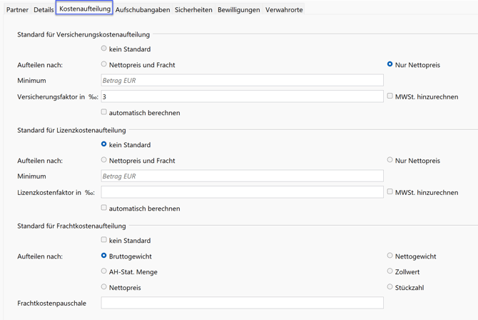 Im Reiter „Kostenaufteilung“ können Versicherungs- und Lizenzkosten und deren Aufteilung vordefiniert werden. Ebenso kann Scope diese Kosten in jede Importanmeldung übernehmen, dazu muss die Checkbox „automatisch berechnen“ aktiviert sein, oder ad hoc nach Kosten schauen, sofern im Atlasantrag die Checkbox für Versicherung oder Lizenzkosten aktiviert wird. Bei der Frachtkostenaufteilung kann definiert werden, auf welcher Grundlage die erfassten Frachtkosten aufgeteilt wurden. Wir empfehlen als Standard nach „Nettogewicht“ aufzuteilen, da dieser Wert in jeder Position enthalten ist und Fracht meist nach Gewicht berechnet wird. Als Beispiel: Nettopreis 1000 und in den Stammdaten wurden 10% hinterlegt, werden 100 als Fracht gezogen und aufgeteilt.