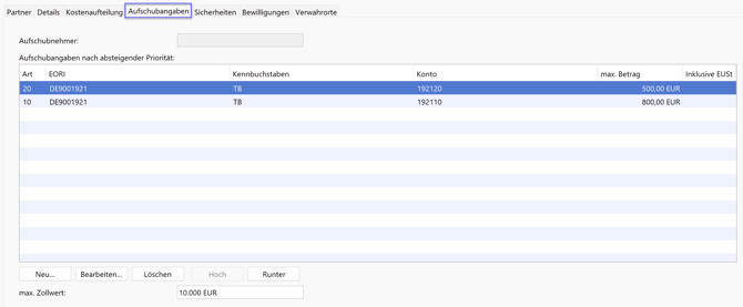 Der Reiter "Aufschubangaben" wird dazu genutzt, die Aufschübe, welche für die Einfuhr verwendet werden sollen, zu hinterlegen. Es können über neu die Konten 10, 15 und 20 erfasst werden. Es kann für den Geschäftspartner ein Aufschubnehmer erfasst werden, von dem die Aufschubkonten gezogen werden sollen. Dies verhindert unnötige Doppeleingaben von Aufschubkonto, wenn sich mehrereTeilnehmer dieselben Aufschübe teilen. Wird ein maximaler Bürgschaftsbetrag erfasst, wird in Scope eine Warnung angezeigt, wenn dieser in der laufenden Abrechnungsperiode überschritten wird.