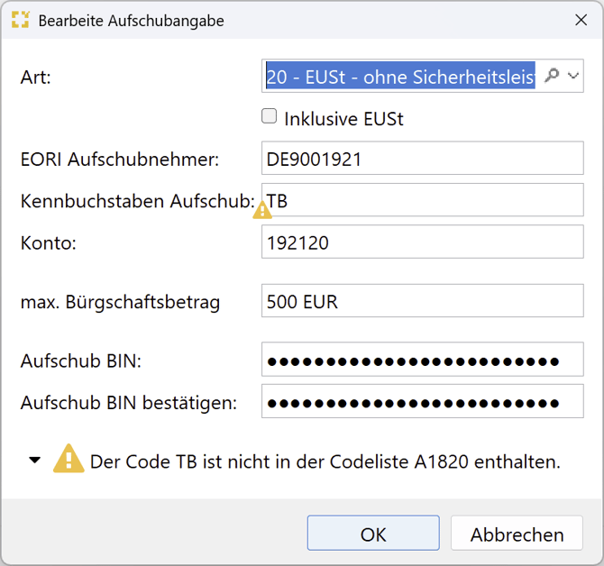 Der maximale Zollwert löst eine Warnung bei Überschreitung im Antrag aus. Dies sollhelfen,n interne Kontrollsysteme zu unterstützen. Weiterhin kann dieser Wert auch helfen, Typofehler zu verringern, da es vorkommen kann, dass in einem Antrag statt 10000 schnell mal 100000 oder 1000000 erfasst wird.