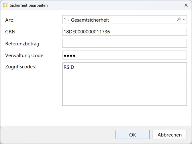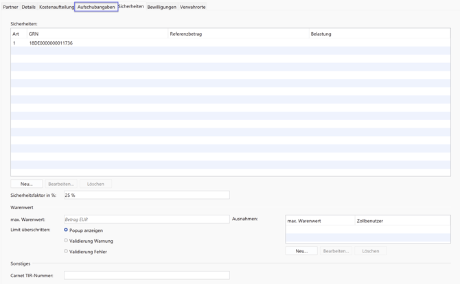 Als Sicherheitsfaktor kann ein Standardwert definiert werden, der im Zusammenspiel mit dem erfassten Warenwert die zu leistende Sicherheit berechnet. So können z. B. 25% hinterlegt werden. Bei einem Warenwert von 10.000 werden dann 2500 als Sicherheit an den Zoll übermittelt.
