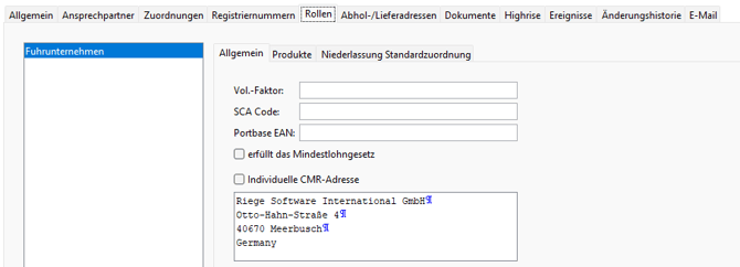 | Fuhr-unternehmen | Wenn Sie Abhol- und Lieferscheine erstellen, muss die Adresse des Spediteurs (Truckers) die Rolle Fuhrunternehmen haben. Andere verkehrsträgerspezifische Details werden hier gespeichert:![]() |