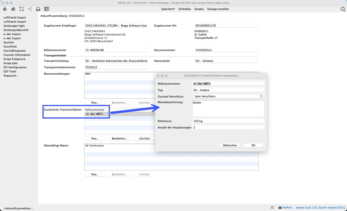 Es kann vorkommen, dass man eine Warenanmeldung Durchfuhr als Notfallverfahren (Notfall VBD) erhält und dann darauf eine Ankunftsanmeldung erstellen muss. In diesem Fall muss die Ware dann in der Ankunftsanmeldung (NT007) unter zusätzliche Transitverfahren erfasst werden.