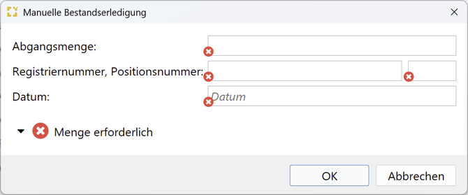 Der Link „Manuelle Erledigung erfassen“ öffnet ein neues Fenster, in dem die Abgangsmenge, Registriernummer und Position sowie das Datum erfasst werden müssen. Dies kann notwendig sein, wenn sich ATLAS-Nachrichten nicht einarbeiten lassen oder bei einem Systemwechsel ggf. Bestände nicht korrekt durch die Nachrichten verbucht wurden und bereits ein Bestand eingelagert wurde.