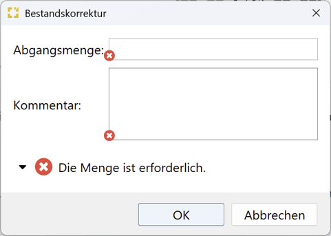In dem Fenster müssen die Menge und ein Grund erfasst werden. Soll Bestand hinzugefügt werden, so muss ein „-“ vor der Anzahl gesetzt werden.