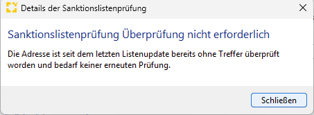 Per automatisierter Abfrage prüft Scope nun, wann die Adresse zuletzt geprüft wurde und ob zwischenzeitlich die Sanktionsliste ggf. aktualisiert wurde, sodass eine neue Prüfung notwendig ist. Die Prüfung erfolgt automatisch, sobald eine Adresse/ein Geschäftspartner in einem Vorgang eingefügt/verwendet wird. Es werden also nicht alle Adressen in Scope geprüft, sondern immer nur die aktuell verwendeten Adressen, zu der der Zeitstempel der letzten Prüfung hinter dem des Listen-Datums liegt. - Sie haben bestimmte Abläufe und wollen die Prüfung zu einem bestimmten Zeitpunkt in ihrem Workflow anstoßen? Dann nutzen Sie bitte die manuelle Prüfung via Extras > Sanktionslistenprüfung... um alle Adressen der Sendung/Order in einem Zug prüfen lassen.