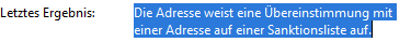 Klicken Sie auf „Adresse prüfen und ähnliche Adressen anzeigen“ und Scope zeigt eine Reihe von ähnlichen Adressen an mit Ähnlichkeitswert in %. Auch können hier Details zur Sanktionslistenprüfung für die ausgewählte Adresse angezeigt werden.