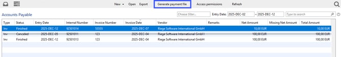 You can now create the payment file under Finance > Accounts Payable by clicking on Generate payment file. You can either generate a single payment file for the entry highlighted in blue, or select multiple entries and generate one payment file for all of them together.