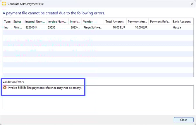 If that's the case, close the dialog window, correct the error, and click Generate payment file again.