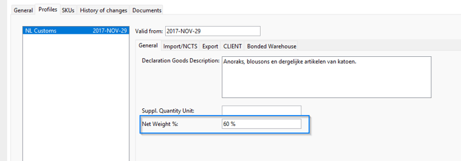 Standaard wordt het nettogewicht vastgesteld op 85% van het brutogewicht. Indien er een artikel bekend is op de post van de aangifte zal Scope kijken of er op het artikel een afwijkend percentage is opgegeven en dat gebruiken.