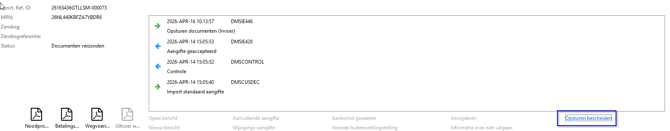 Zodra een DMS-invoer- of uitvoeraangifte de status Controle krijgt, wordt de optie Opsturen bescheiden actief.