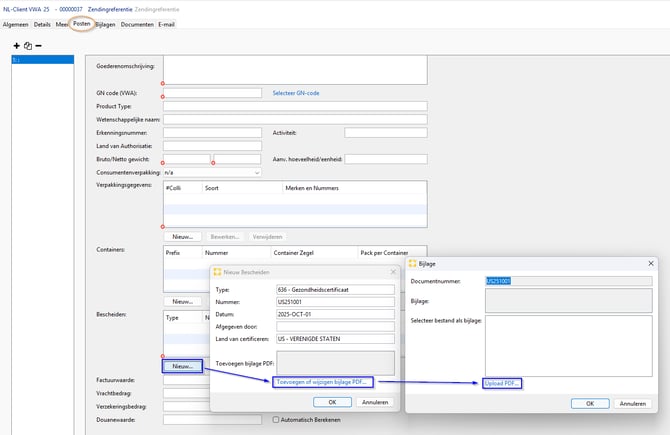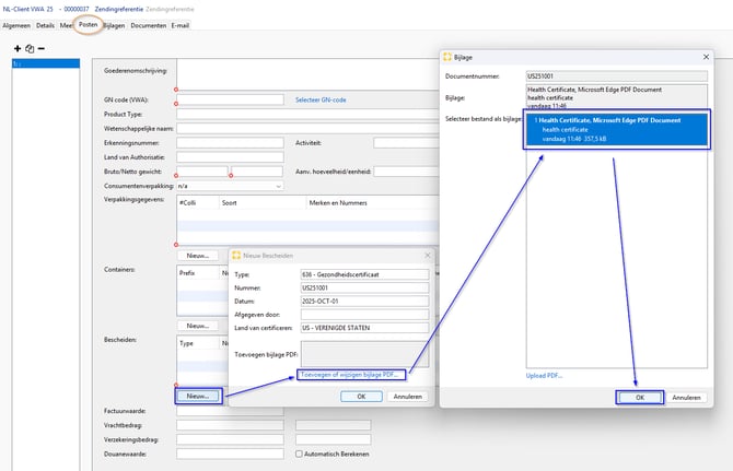 In de VWA-aangifte kunnen bescheiden worden vermeld. Daarnaast kun je de PDF van het document (certificaat) uploaden en koppelen aan de aangifte. Deze wordt vervolgens samen met de aangifte naar de NVWA verzonden.