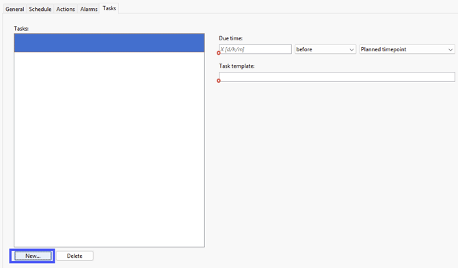 - In the entry dialog for an exception within a tracking template or in the exception template itself, you can create one or more tasks by clicking the New button in the Tasks tab.