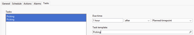 - In the entry dialog, you must specify a due date. This can be indicated in days (d), hours (h), or minutes (m) (e.g., 1d = 1 day). You can select whether the due date is before or after the planned time, or relative to the start or end of the planned time window. Additionally, a task template must be selected.